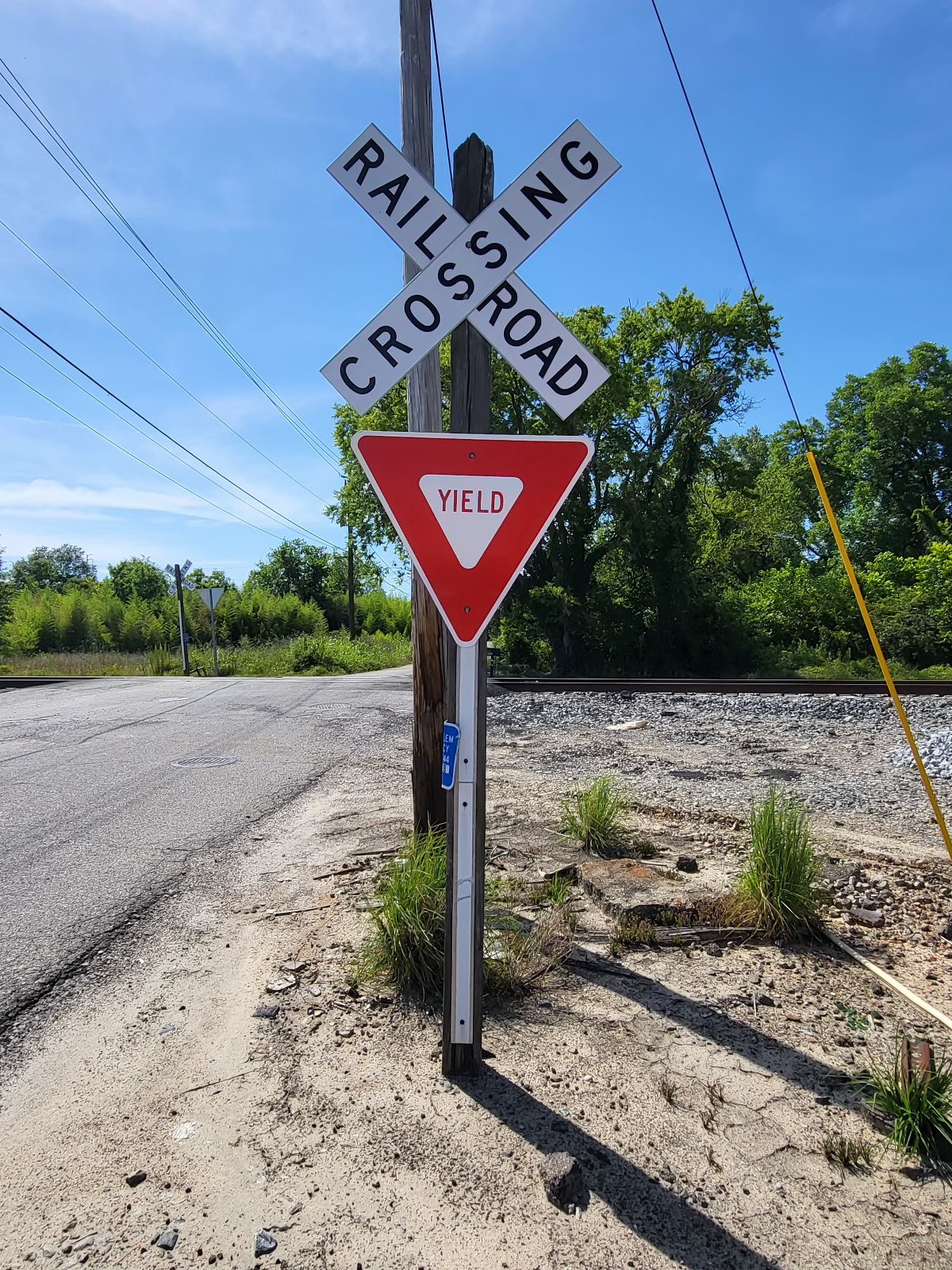 - Includes modern RAILROAD CROSSING crossbuck paired with a YIELD sign below