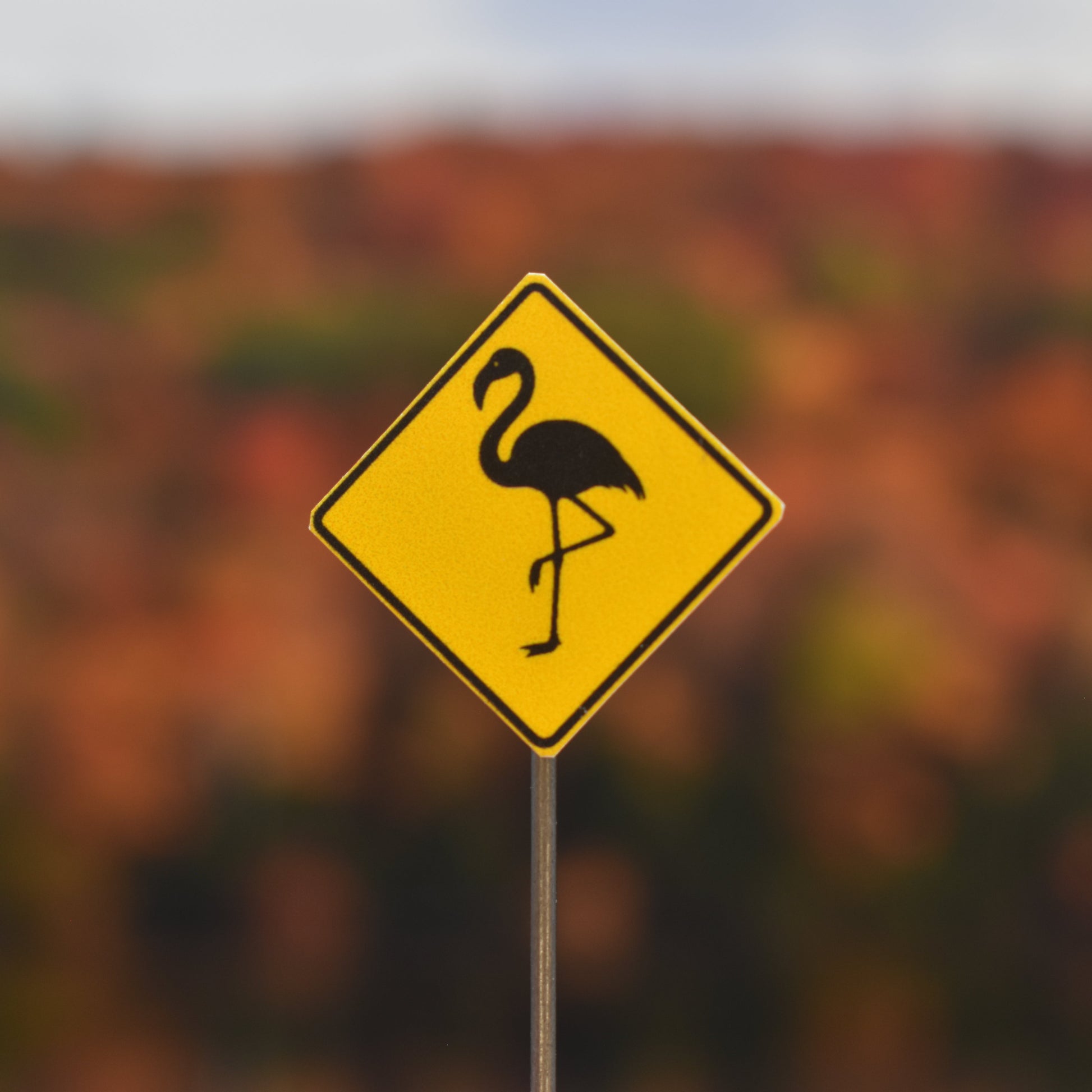 - Diamond-shaped yellow crossing sign with bold black flamingo silhouette