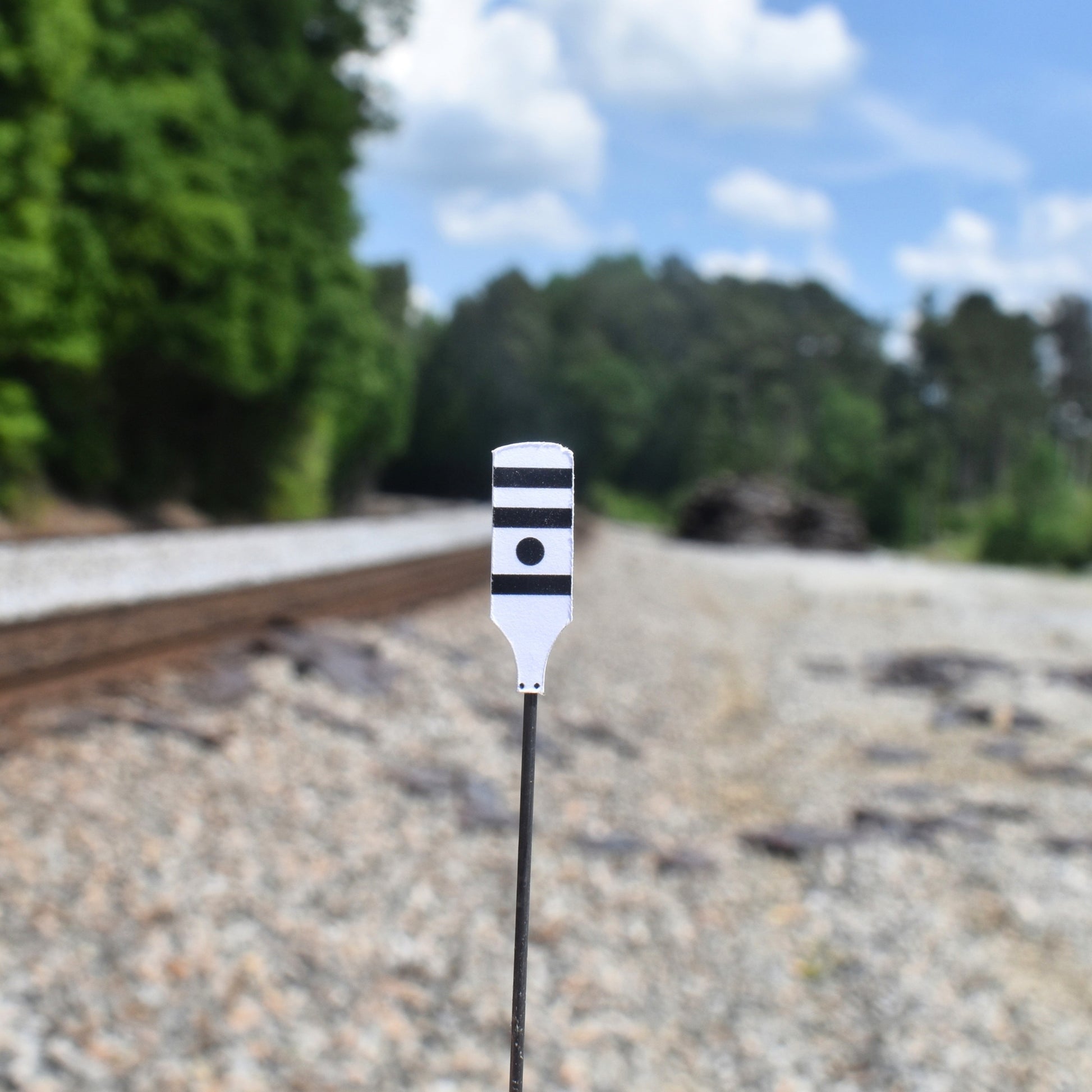 Add authentic Southern charm to your layout with our Southern Railway Whistle Post! Faithfully modeled after the classic signs used throughout the Southeast, this piece features the distinctive black-and-white striped pattern with central dot—a signature look that instructed engineers to sound the whistle before a grade crossing.